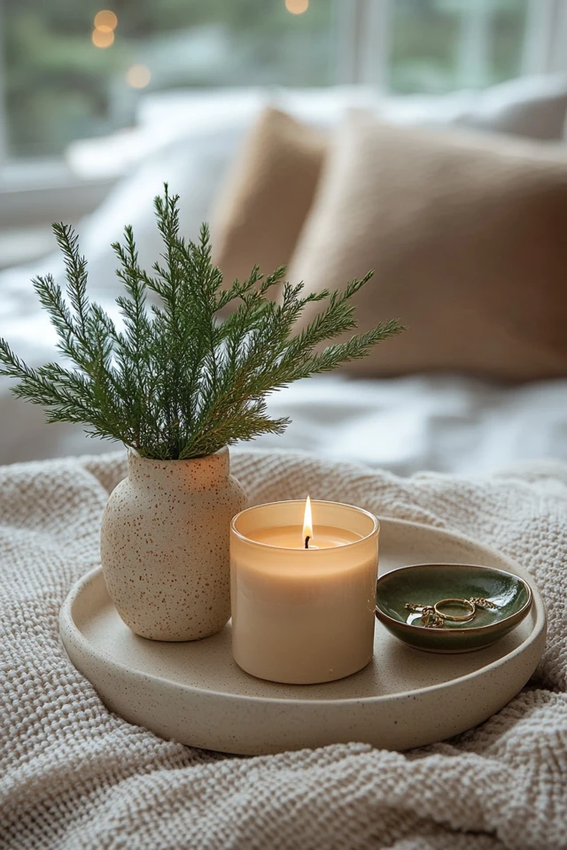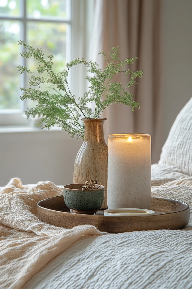 - Use a decorative tray on your nightstand to hold candles, skincare products, or jewelry.