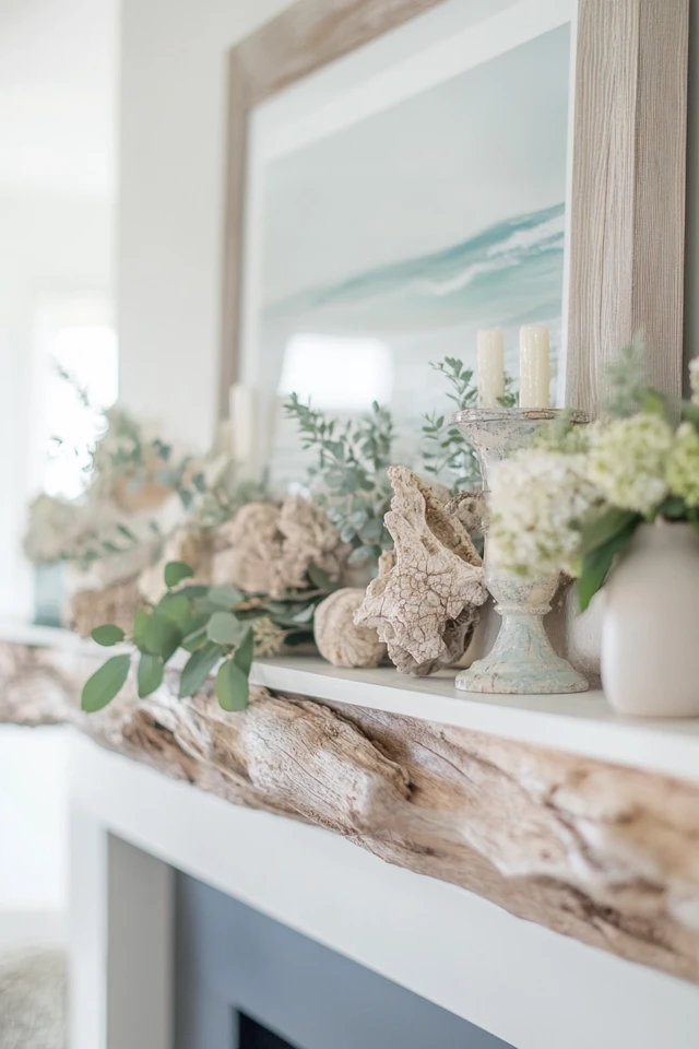 Keep coastal accents simple and understated to maintain versatility. Driftwood sculptures, ocean-inspired artwork, and textured vases work year-round without feeling tied to a specific season.