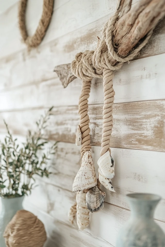 A rope-wrapped mirror adds texture and nautical charm, making it the perfect coastal accent.