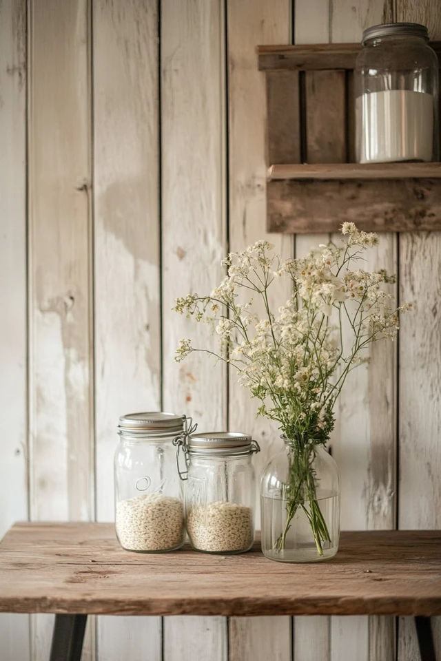 - Style the shelves with farmhouse decor like vintage books, pottery, and plants.