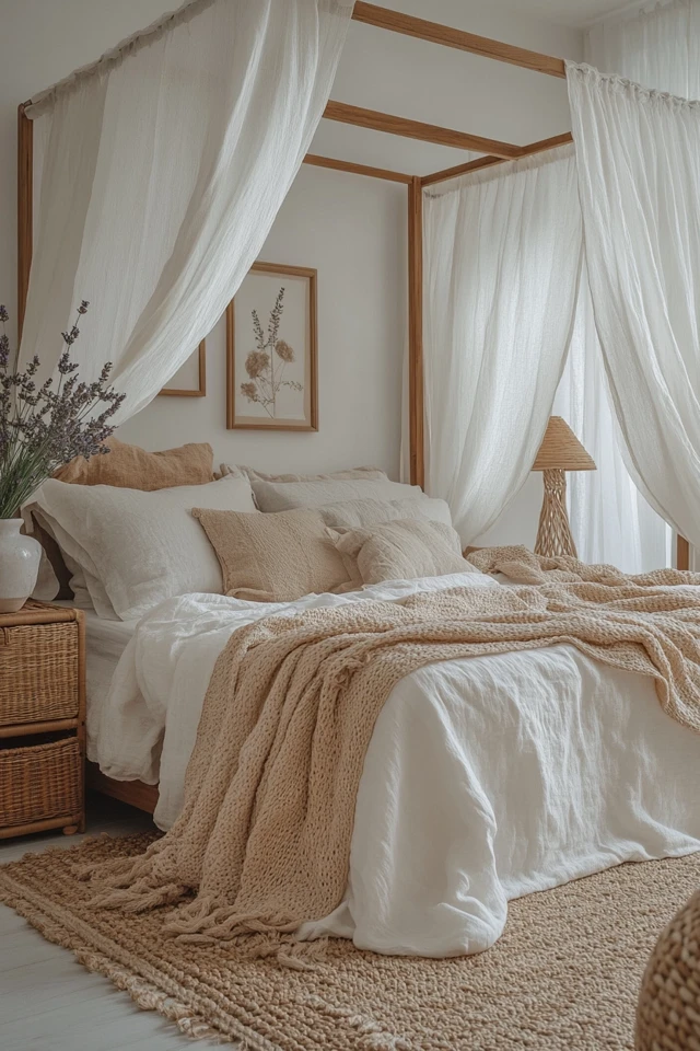- Add a rattan or wood headboard for an earthy touch.