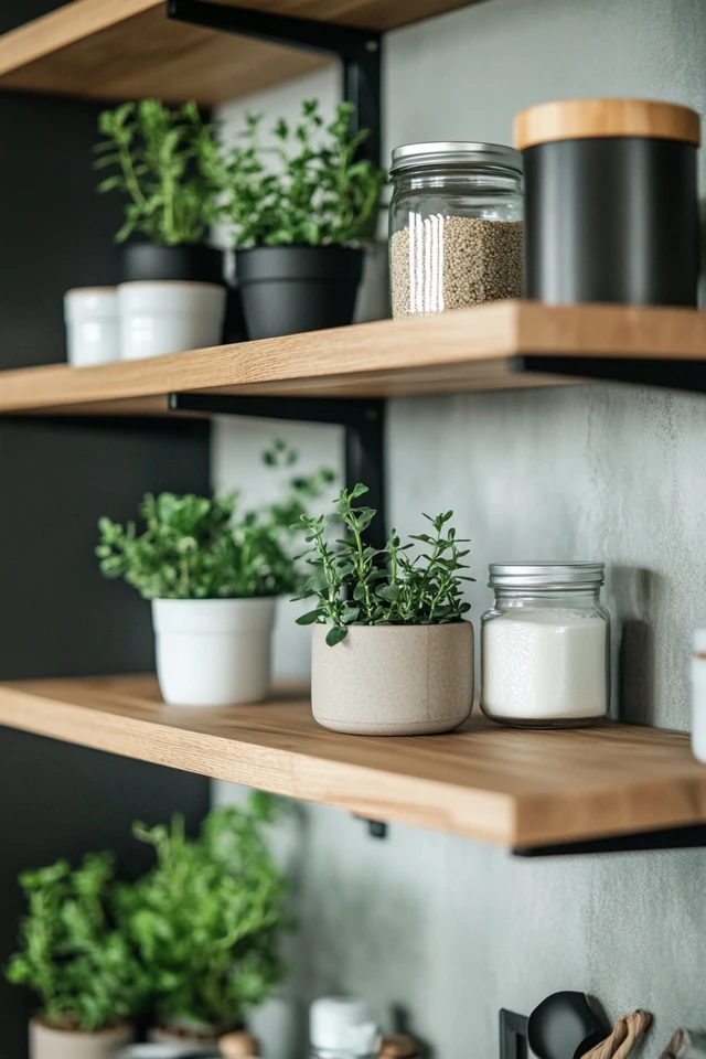 - Install light wood or white shelves to complement the neutral tones of your kitchen.