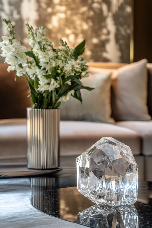 Glass and crystal accessories add sparkle and elegance without feeling heavy.