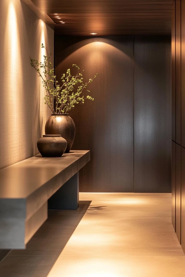 Plants bring life and freshness to a minimalist entryway without overwhelming the space.