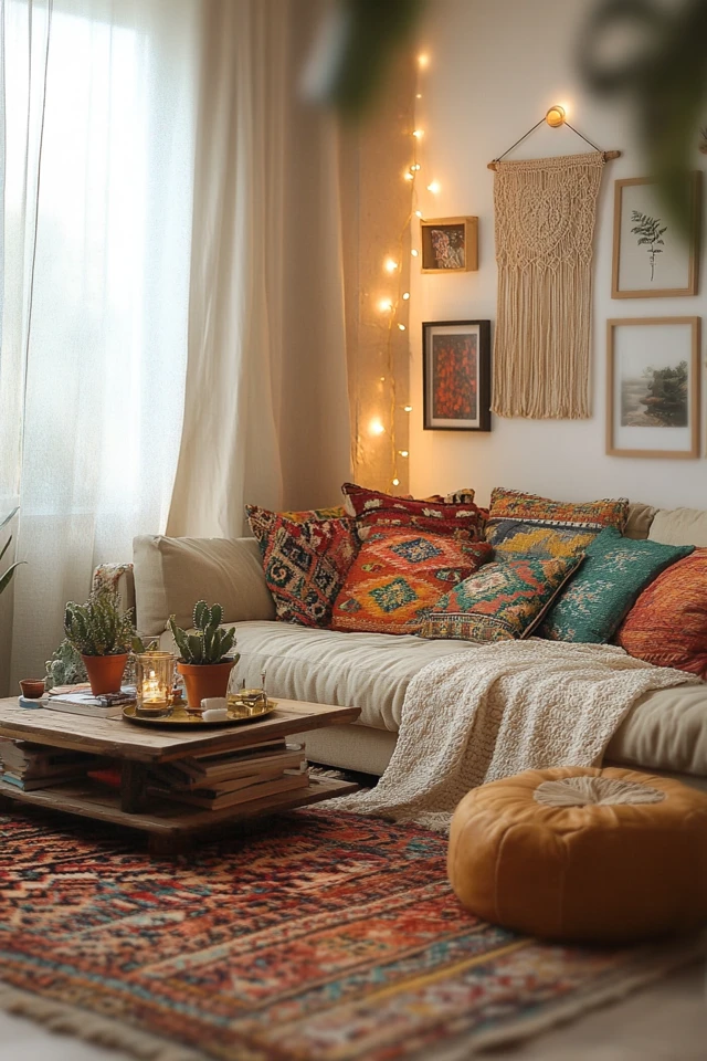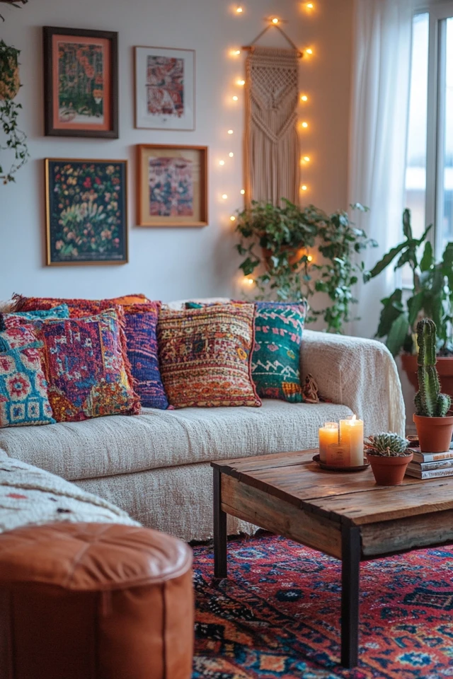 - Use Moroccan, tribal, or geometric patterns on rugs, pillows, and throws.