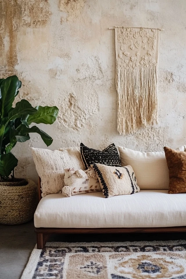 Start small with affordable items like throw pillows, macramé wall hangings, or thrifted decor. Layering textures can also create a boho vibe without a big investment.