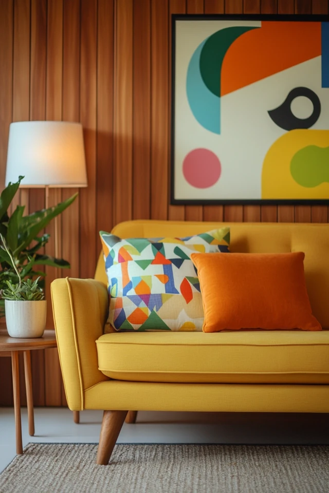 Retro colors like mustard yellow, teal, burnt orange, olive green, and deep red are perfect for mid-century modern spaces.