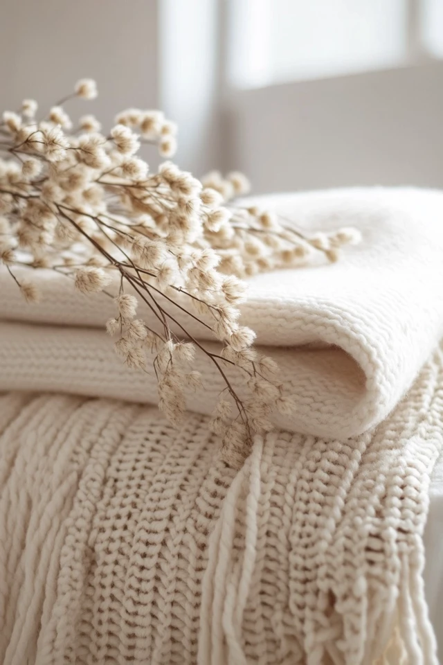 - Winter: Layer chunky knit blankets, faux fur, and wool for added warmth.