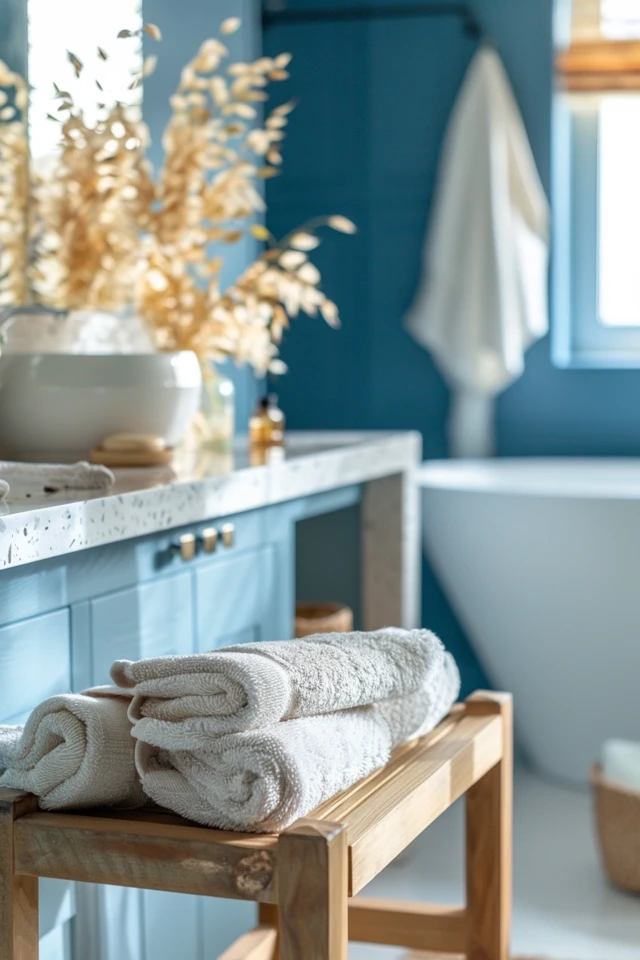 In addition to wall colors, your choice of towels, bath mats, and shower curtains can enhance the coastal theme. Opt for textiles in shades of blue, white, or beige to maintain a cohesive color scheme throughout the bathroom.