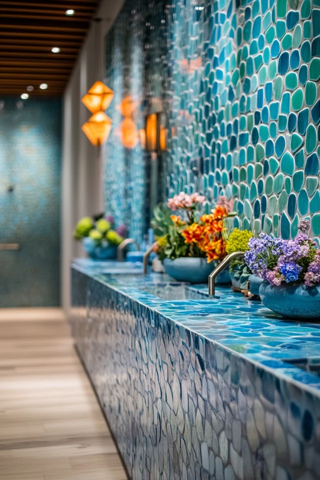 - Use fish scale tiles in shades of blue or green for a bold, aquatic effect.