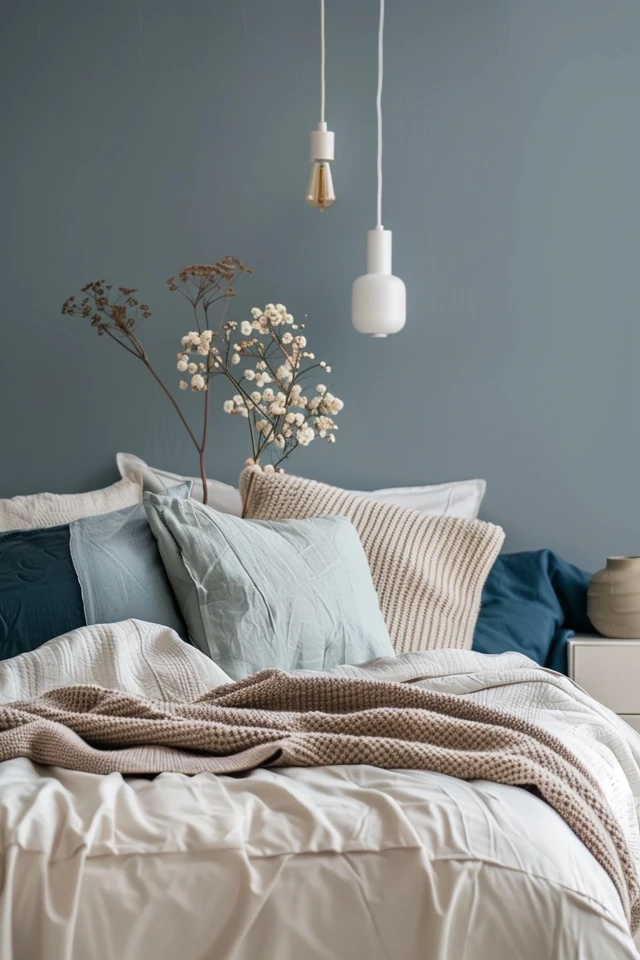 Darker shades, such as navy blue or deep gray, can be used for accent pieces like throw pillows, blankets, or small furniture items. These colors can add a touch of sophistication and create focal points within the room. For example, a navy blue accent chair or a dark gray nightstand can provide contrast without overpowering the overall light and airy feel.