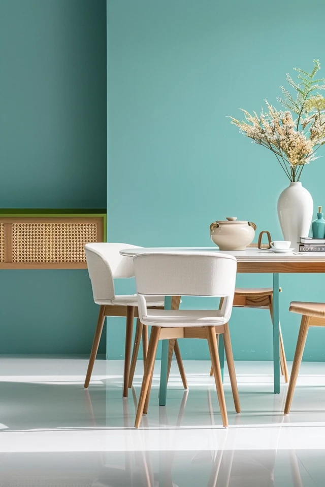 Turquoise can be used for decorative items such as placemats, napkins, and dishware. This color mimics the clear waters of the ocean and adds a refreshing touch. Seafoam green can be incorporated through artwork, rugs, or small furniture pieces, adding a subtle yet vibrant splash of color.