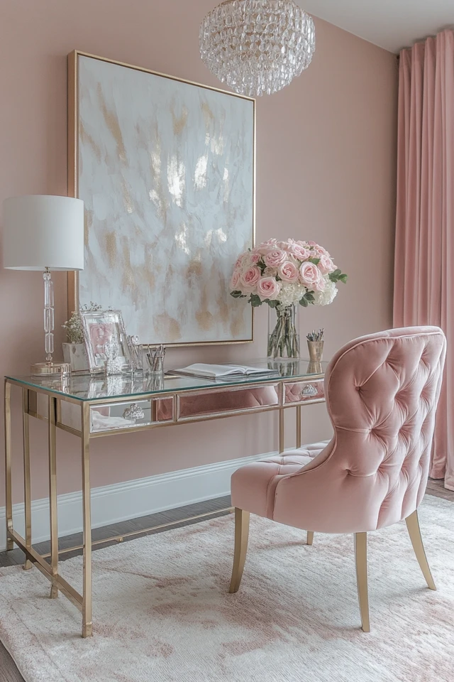 - Glass-Topped Desk: A glass surface with gold or chrome legs exudes modern glam sophistication.