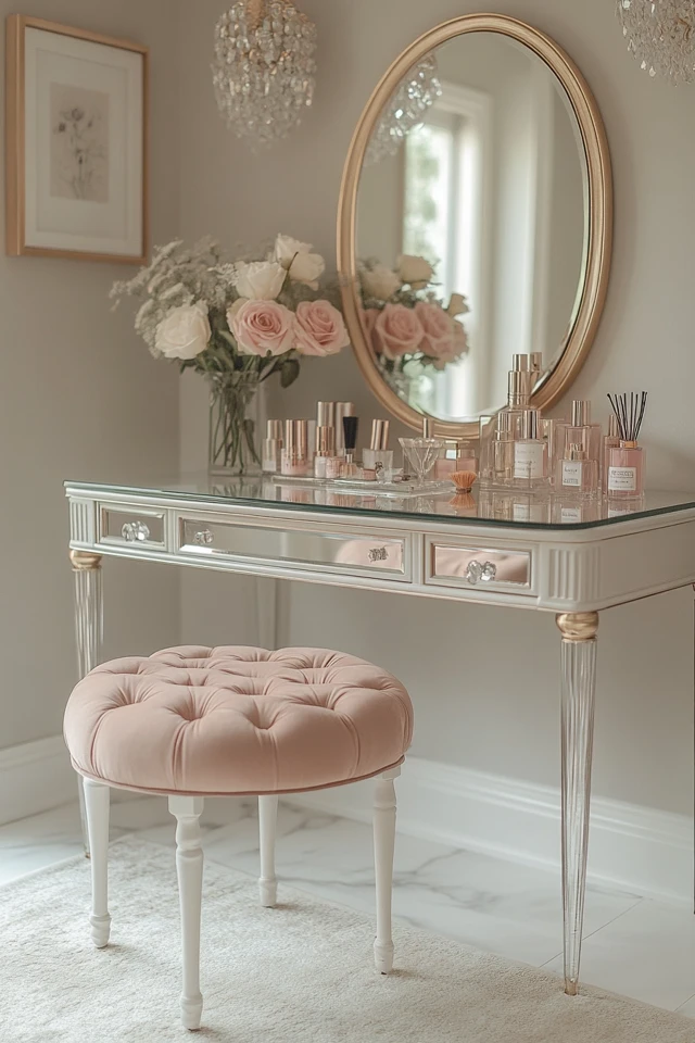 - Mirrored Vanity: A mirrored table adds sparkle, reflects light, and instantly feels luxurious.