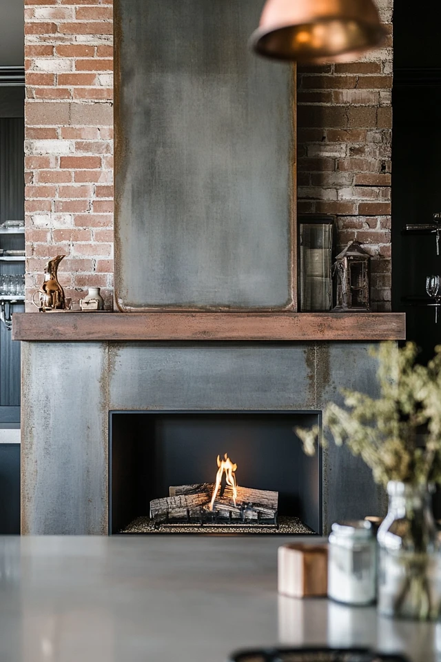 - Why It Works: Reclaimed wood mantels add warmth and a sense of history, softening the harder materials typically found in industrial fireplaces.