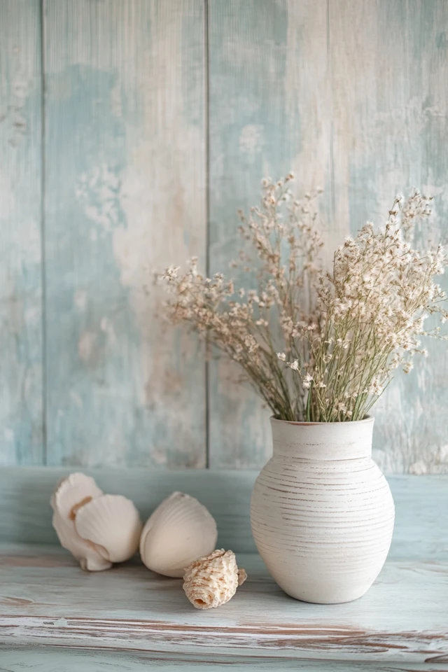- Style the Shelves: Add woven baskets, books, or small coastal accents like a glass vase filled with shells.