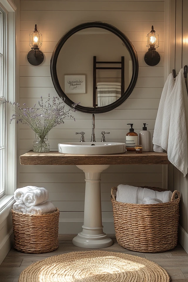 - Metal-Rimmed Mirrors: Black or bronze round mirrors add industrial farmhouse style.