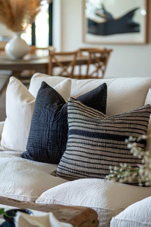 A wooden dining table with a simple design can serve as a focal point in your dining room. Pair it with rattan or wicker chairs to add texture and interest. In the living room, choose a sofa with clean lines and complement it with a mix of throw pillows in various shades of blue and white.