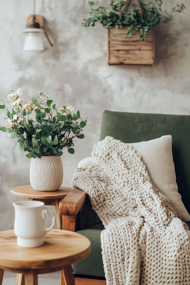- Living Room: Add a jute rug, a chunky knit throw, and linen pillows to your sofa.