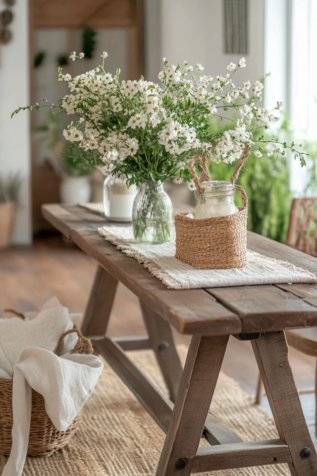 - Dining Room: Use woven placemats, metal chargers, and soft linen napkins for a farmhouse-inspired tablescape.