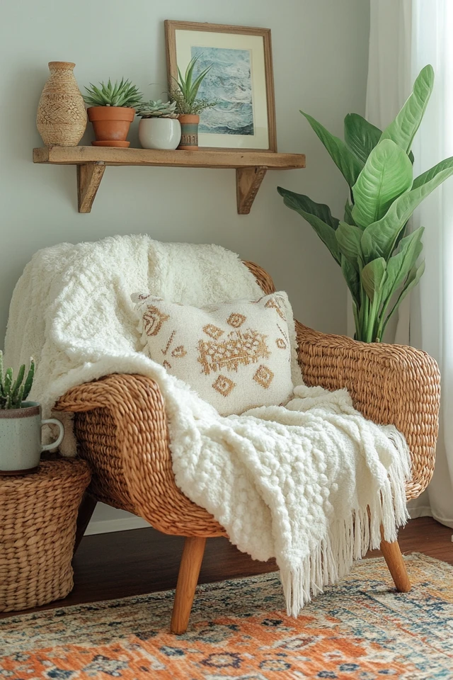 - Surround the area with plants, fairy lights, and textured decor for ultimate boho vibes.
