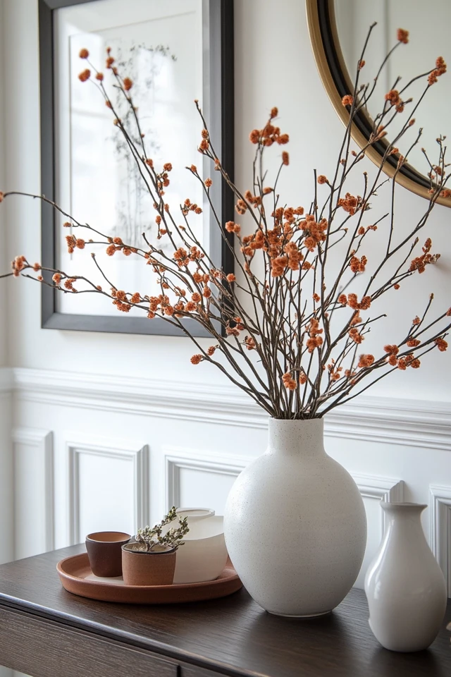 - Decorate with dried flowers, pampas grass, or eucalyptus stems.