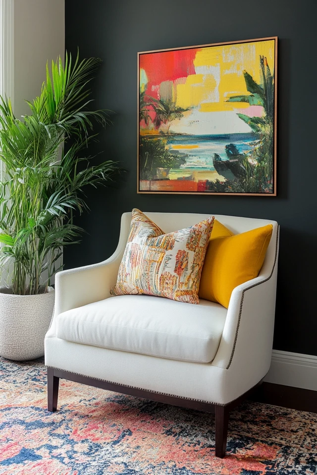 - Accent Chairs: A bright armchair in mustard yellow or teal makes a bold statement.