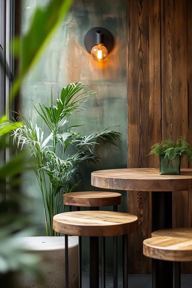 - Use neutral wall colors like white, gray, or taupe to allow the wood and metal elements to stand out.