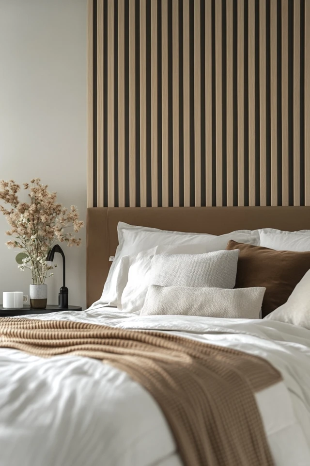 A Scandinavian bedside table with a single ceramic vase and a book maintains a clean, calming aesthetic.
