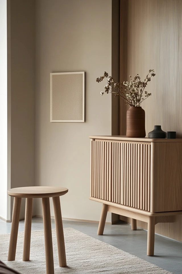 Wooden furniture adds warmth and texture to the minimalist aesthetic, grounding the space in natural materials.