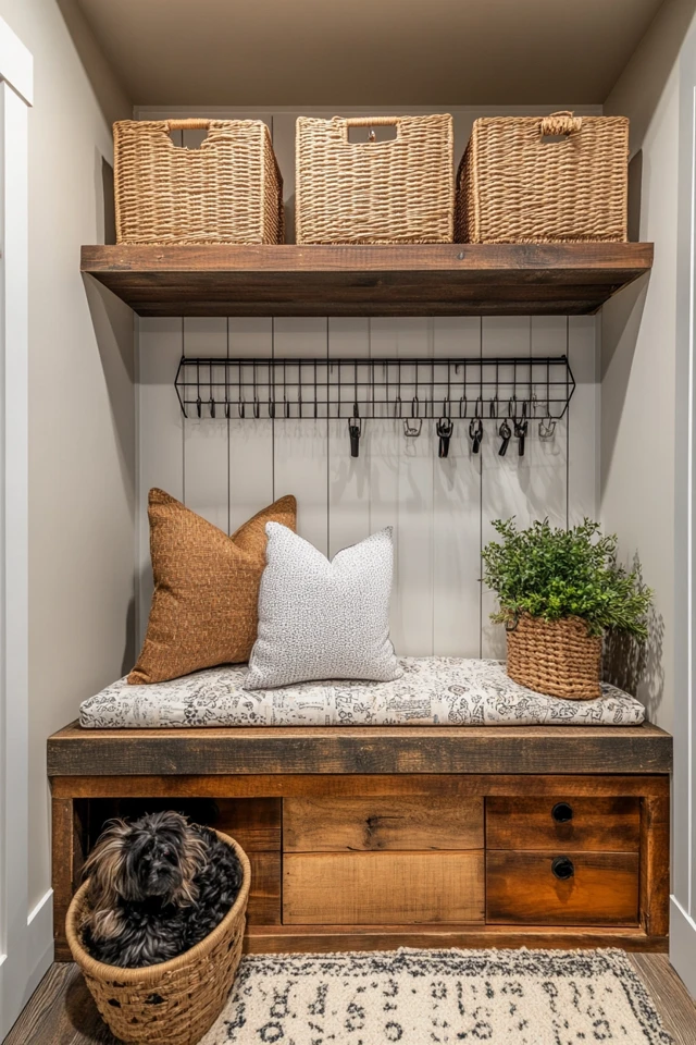 - Industrial Farmhouse Dog Area: Use bold metal elements, darker wood tones, and pipe-style hooks or racks.