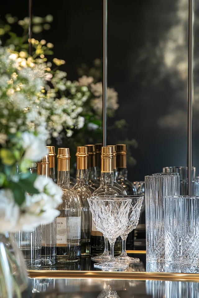 - Metallic Trays: Organize bottles and glasses with a gold or mirrored tray.
