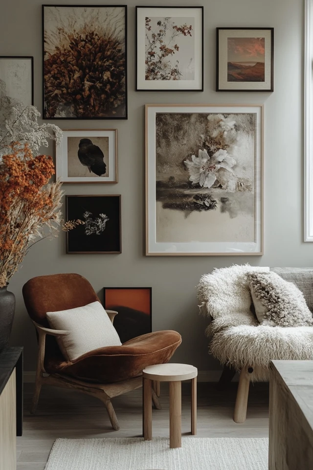 A gallery wall with a mix of gold, black, and natural wood frames creates a balanced yet eclectic style.