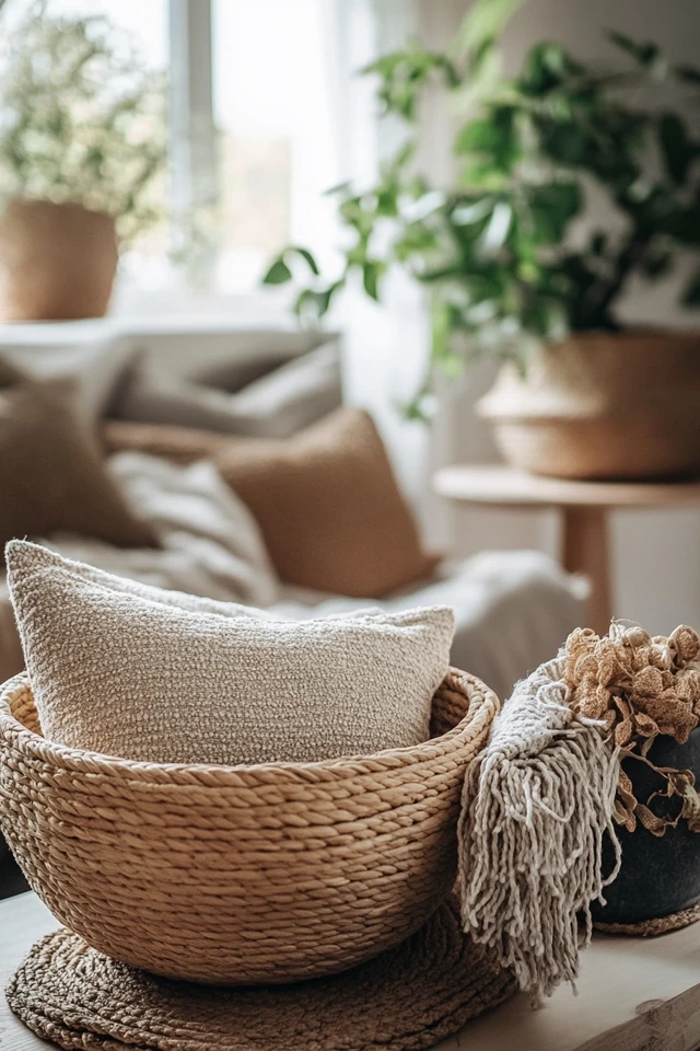 - Incorporate woven elements, like a rattan armchair or wicker baskets, for an earthy touch.