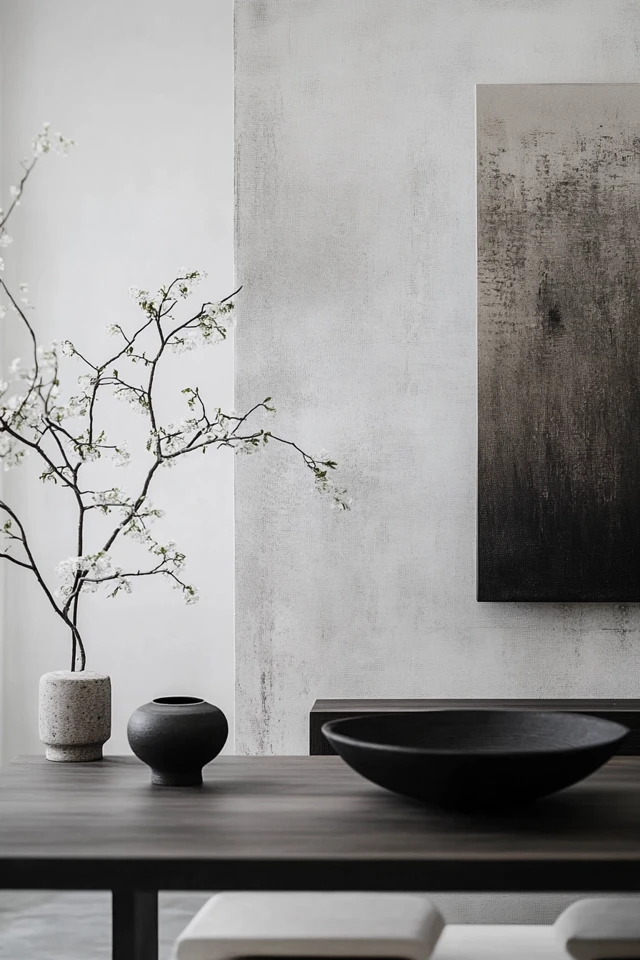- Incorporate sculptural decor, like a round mirror, a minimalist vase, or abstract wall art.