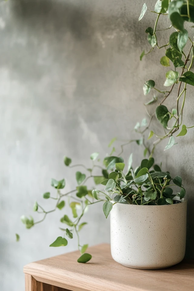 - Add small ceramic planters with trailing plants like pothos or string of pearls.