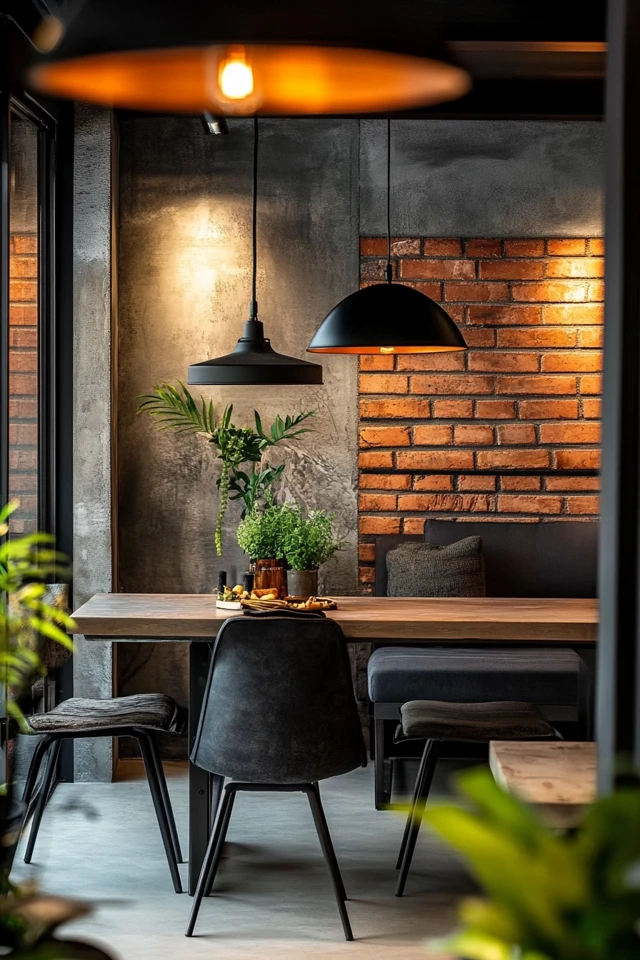 - Why It Works: Industrial lighting adds texture and character while enhancing the room’s ambiance.