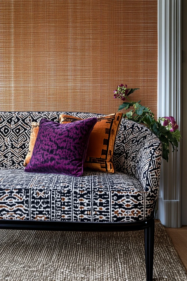 - Use textured throws or cushions in solid colors to soften the impact of bold patterns.