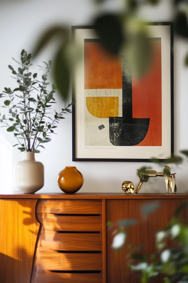 Example: A geometric print in teal and orange hung above a walnut credenza ties together the space with a pop of vintage charm.