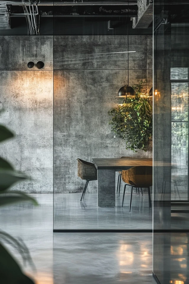 - Walls and Partitions: Use glass panels with concrete borders to divide rooms while keeping them visually connected.
