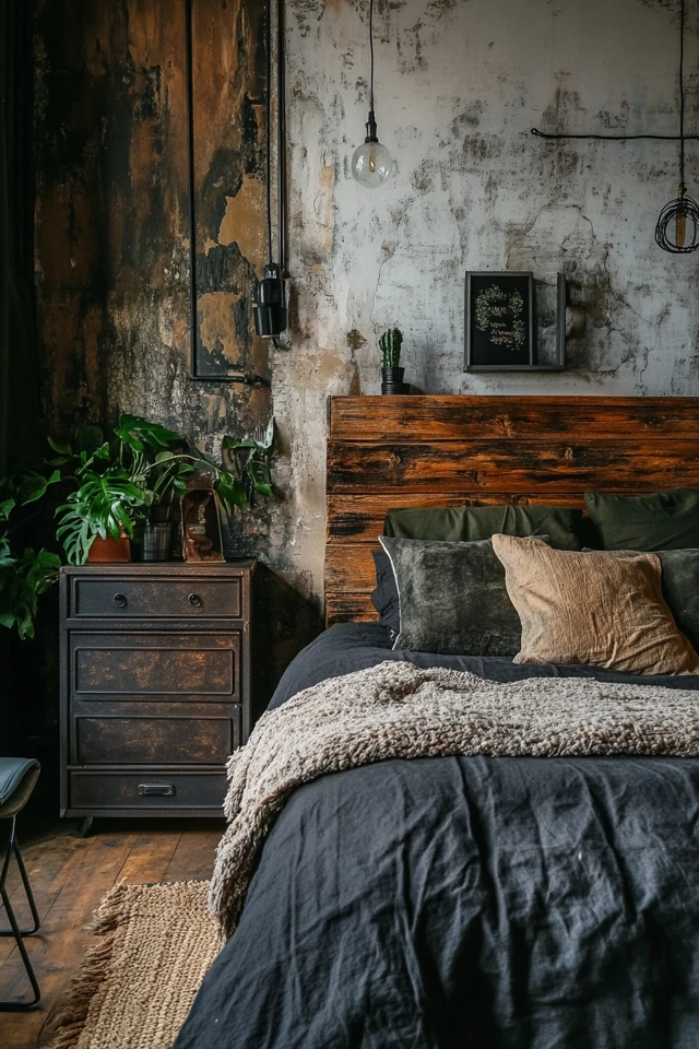 The industrial-chic aesthetic thrives on contrast, pairing rough textures and raw materials with soft, elegant finishes. Here’s why this combination works especially well in bedrooms:
