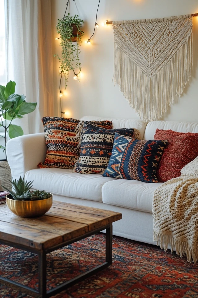 Boho living rooms are all about layering, especially with textured fabrics and materials that add warmth and depth.