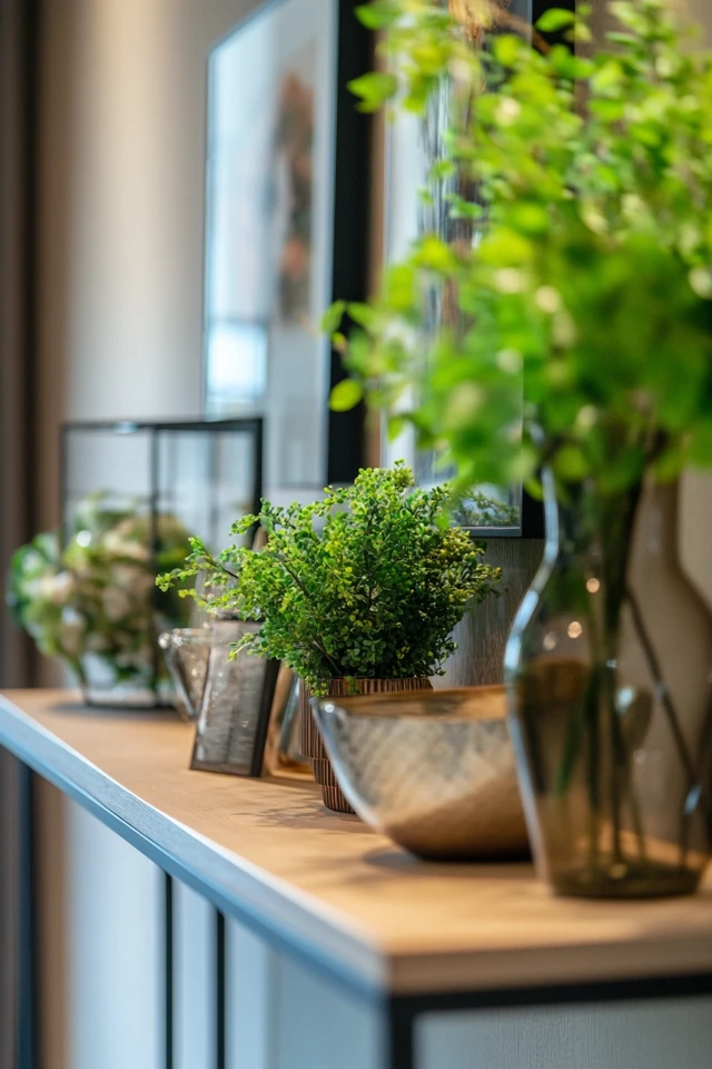 - Finish with Greenery: A vase of fresh flowers or a small potted plant adds life and vibrancy.