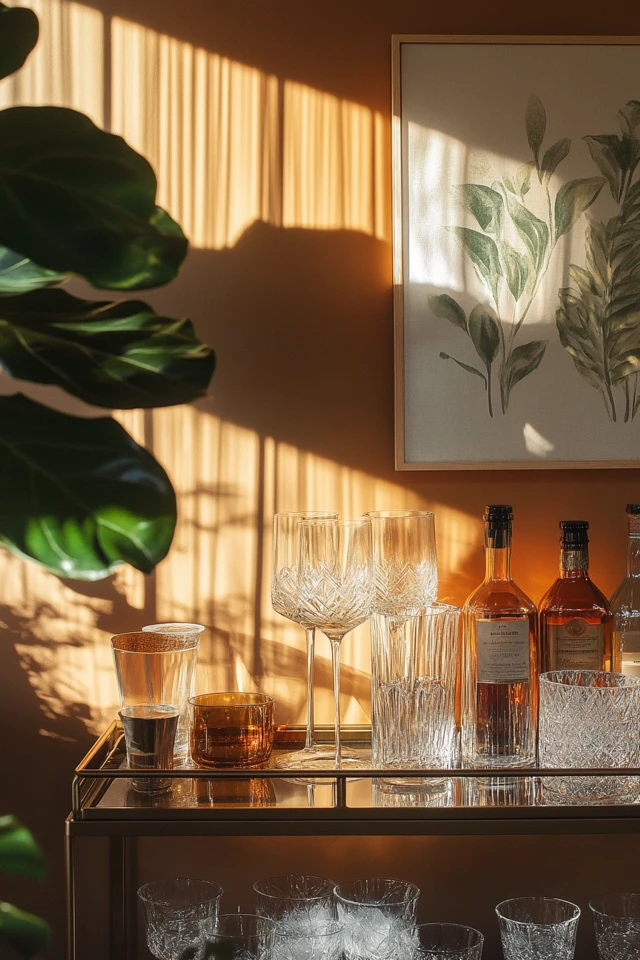 Layering adds depth and dimension, making your bar cart look thoughtfully styled rather than cluttered.