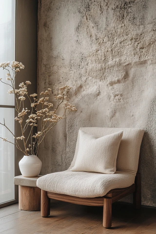 A white chair with a natural oak side table and a cream-colored throw creates a serene, minimalist retreat.