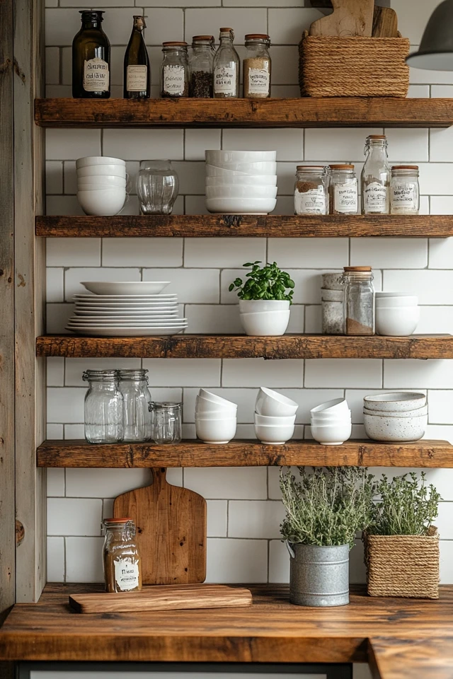 Farmhouse shelving thrives on the balance of functional items and charming decor. Every piece should serve a purpose, whether for storage or visual interest.