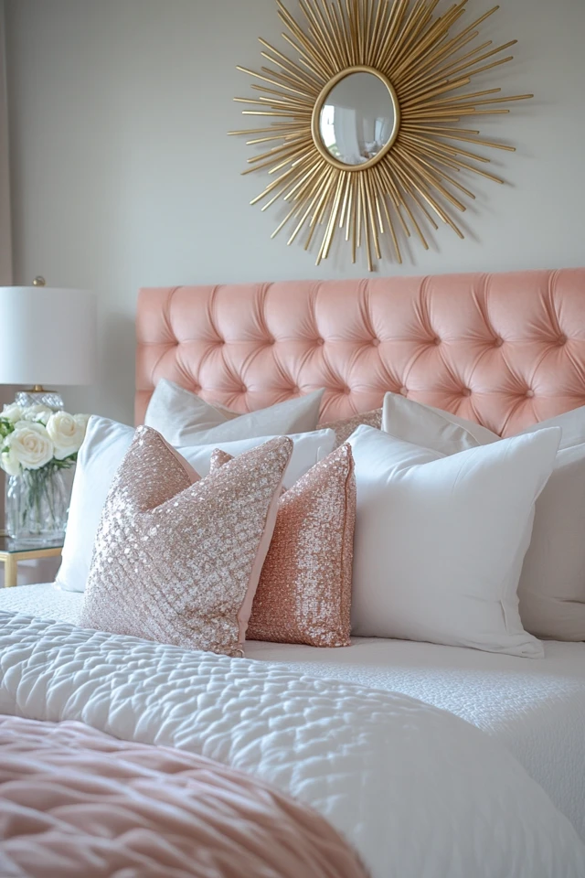 - Velvet Tufted Headboard: Opt for deep jewel tones like emerald, navy, or blush pink. Tufting adds timeless sophistication.