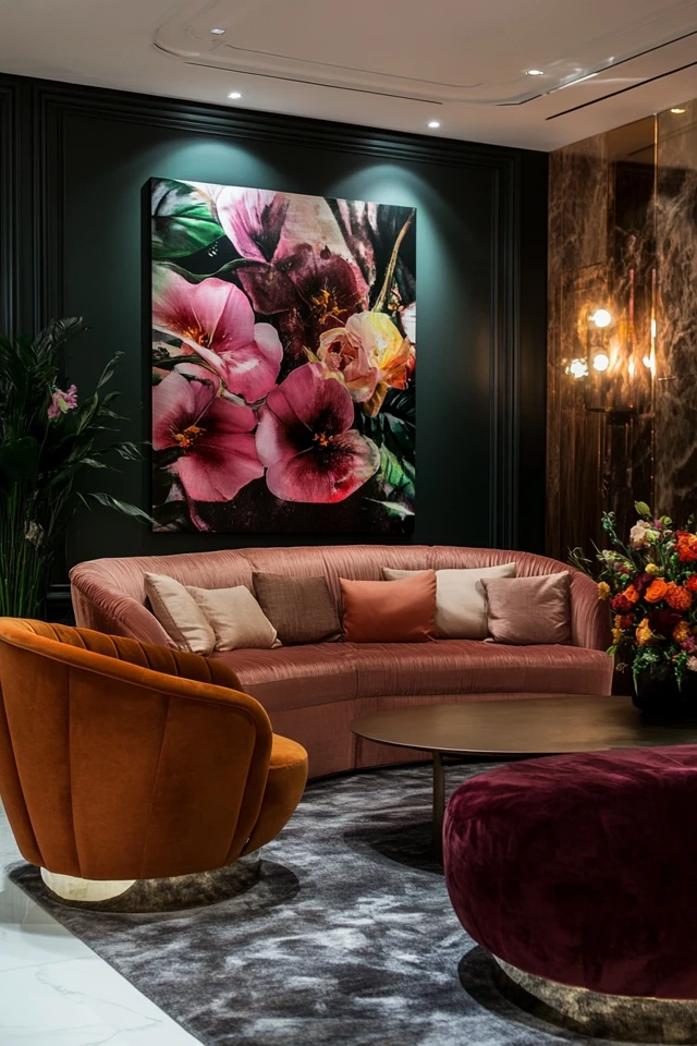 A large abstract painting above the sofa creates a striking focal point while tying together the room’s color palette.