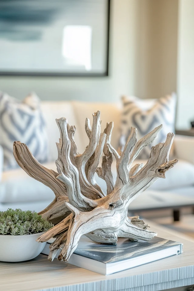 - Place a single, large driftwood piece in the center of your coffee table for a minimalist look.