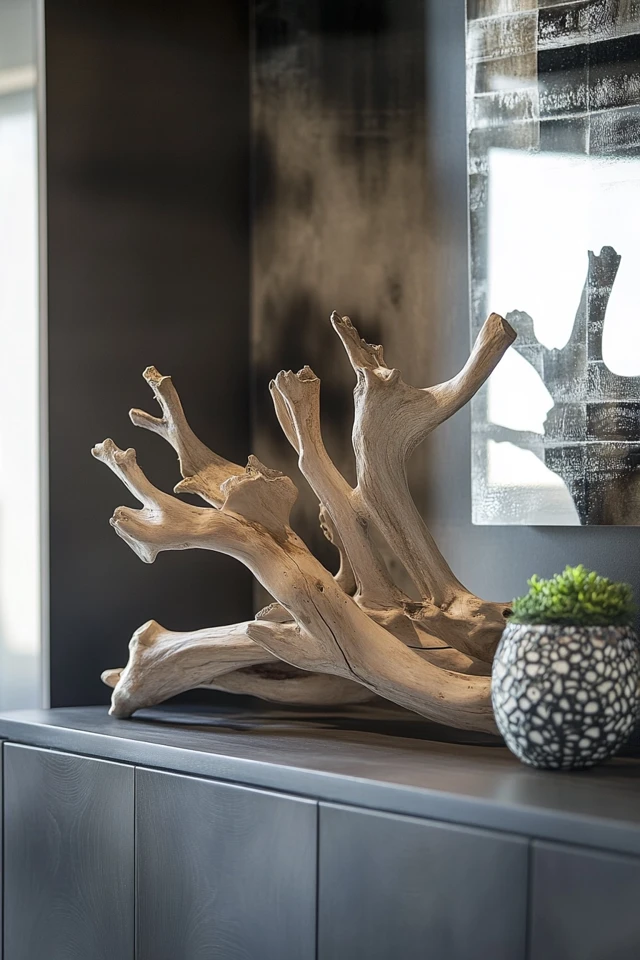 - Place a single, large driftwood piece in the center of your coffee table for a minimalist look.